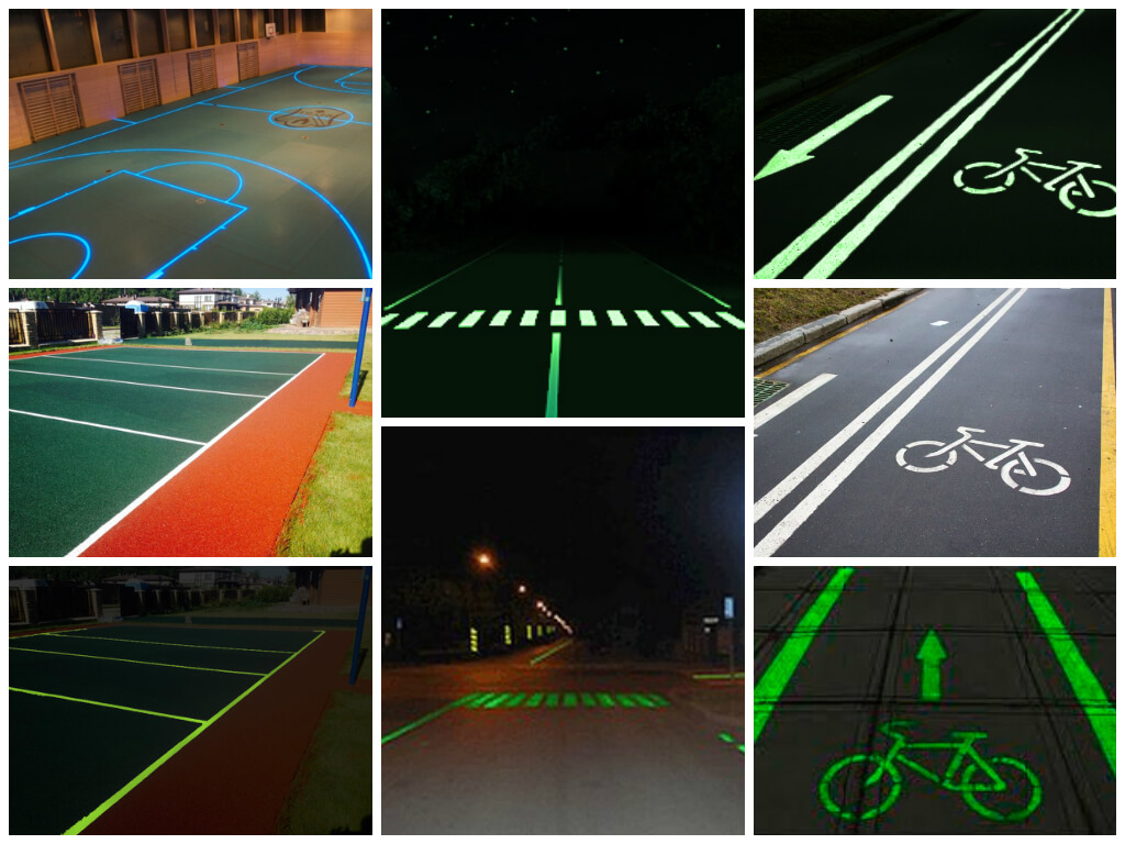 Light accumulative road marking paint designed for painting indoor and outdoor floor surfaces. And it is used for marking pedestrian areas, bicycle paths, as well as for marking on sports fields, etc.