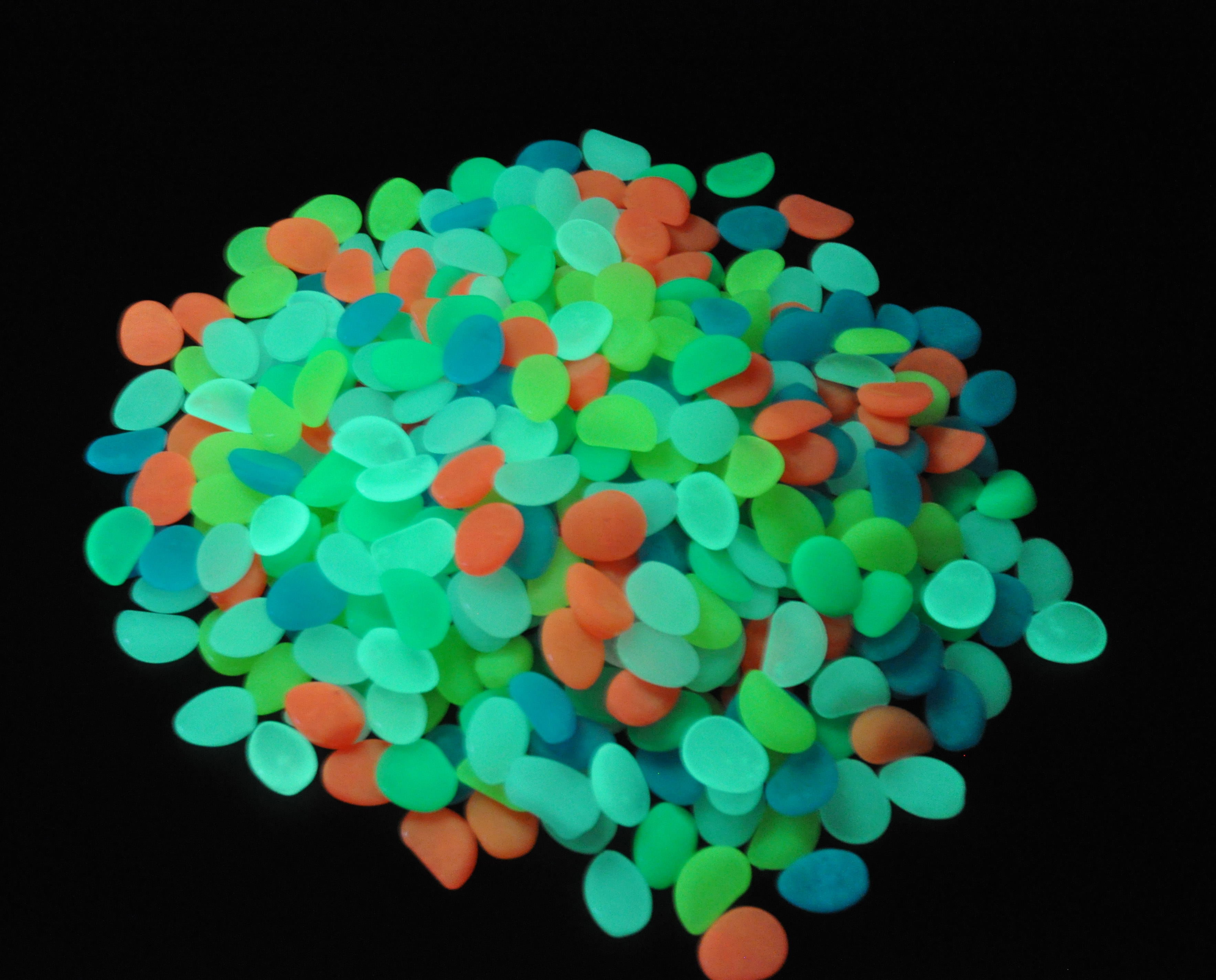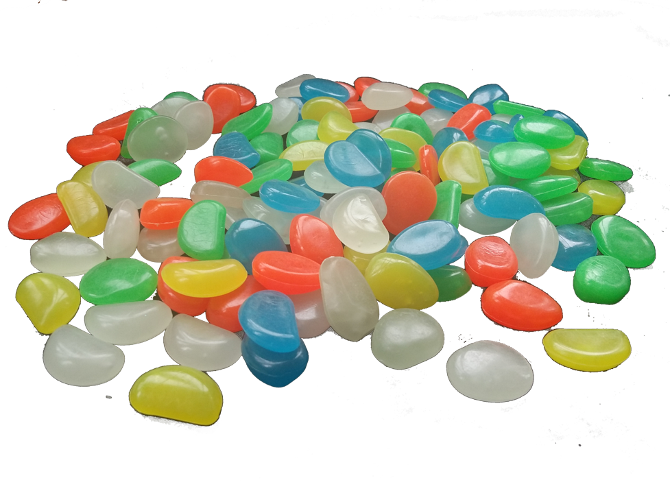 Пластмасові камінці, що світяться в темряві і в ультрафіолеті, виконані у вигляді морської гальки різних кольорів. Вага одного камінчика прибл. 2-2,5 грами.